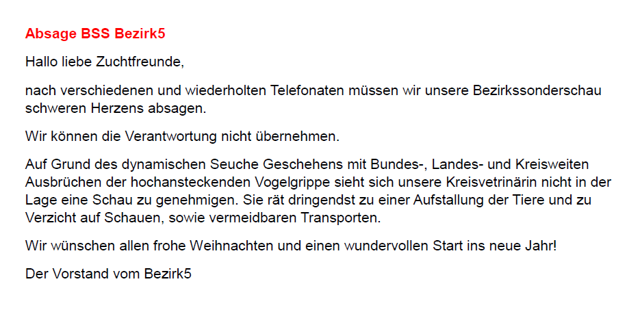 Anlässlich unserer BSS, trafen wir uns dieses Jahr zum zweiten Mal im Züchterheim des KlZV Neresheim. Am 14. und 15. Dezember konnten 172 Kingtauben betrachtet werden, welche durch die Sonderrichter Herbert Saliter, Dieter Klenk, Siegfried Basmer und Günther Baer bewertet wurden. Von ihnen wurde acht Mal die Höchstnote v und elf Mal hv vergeben.