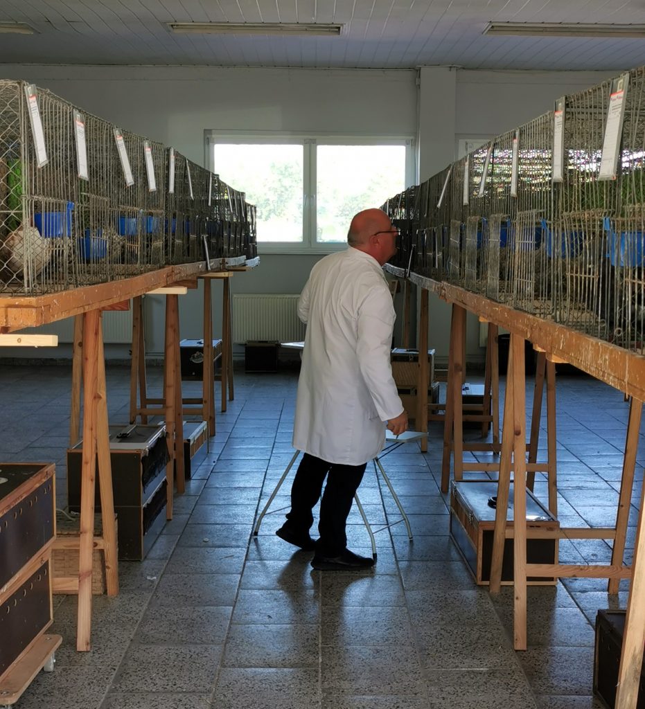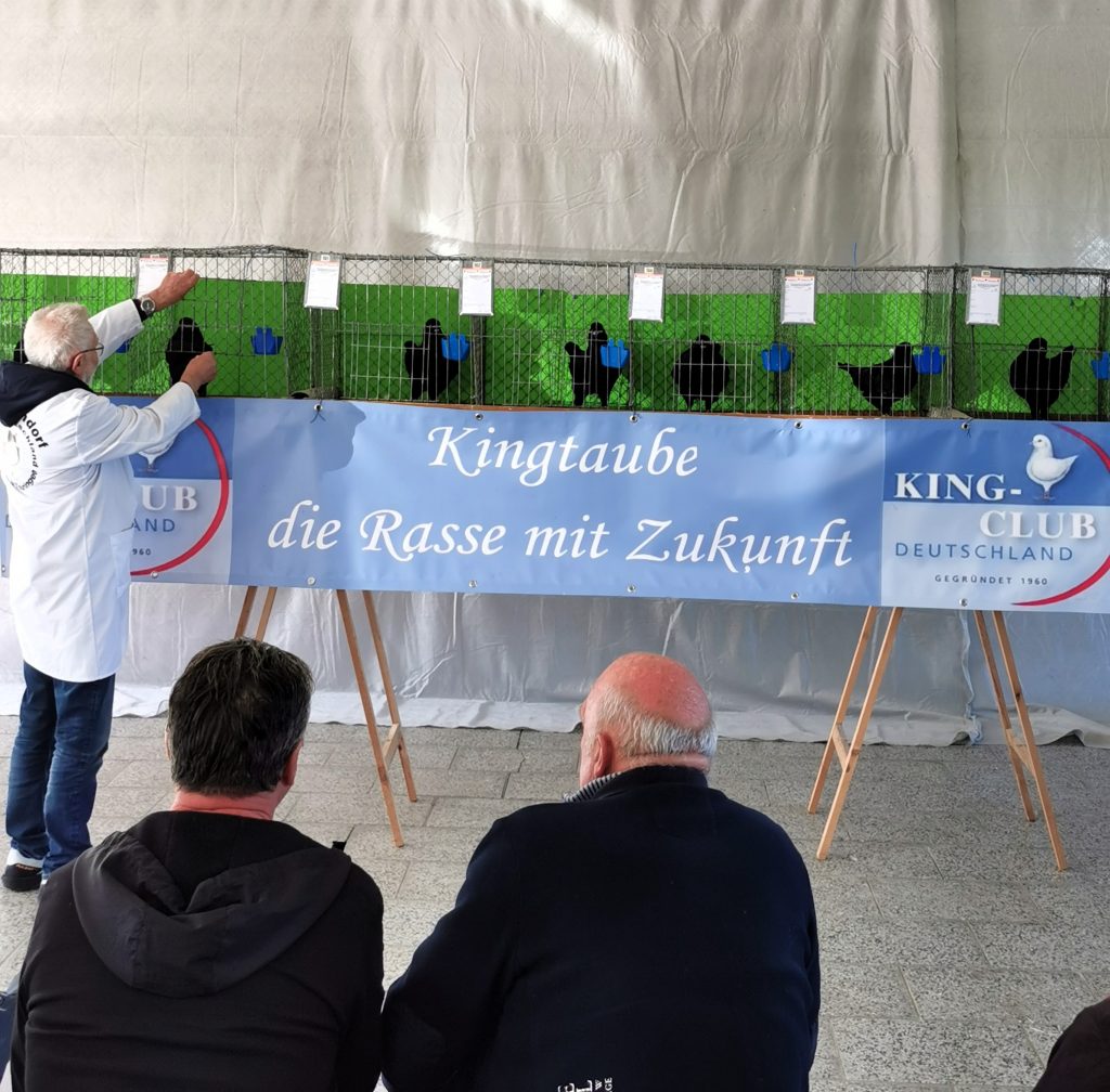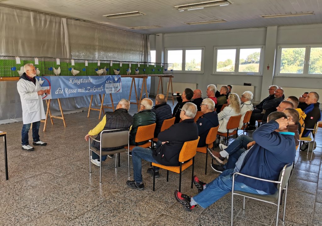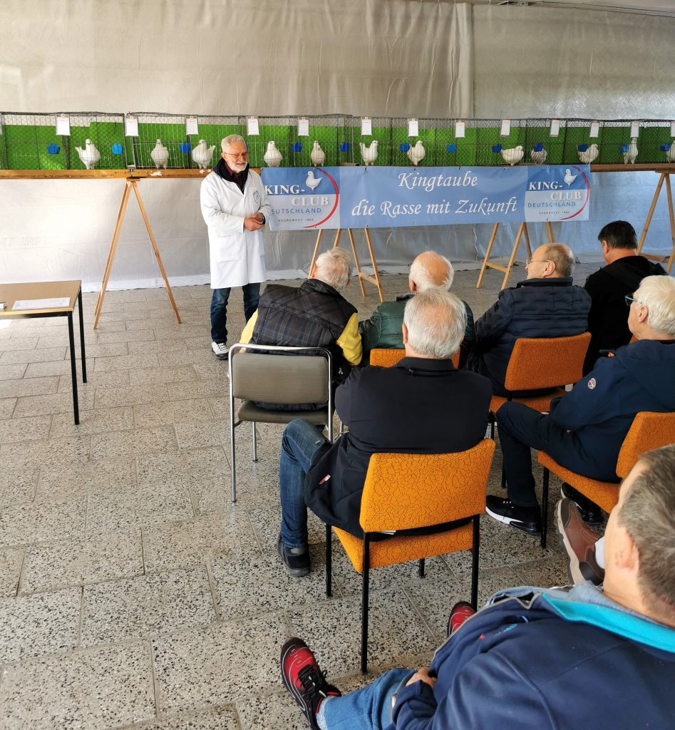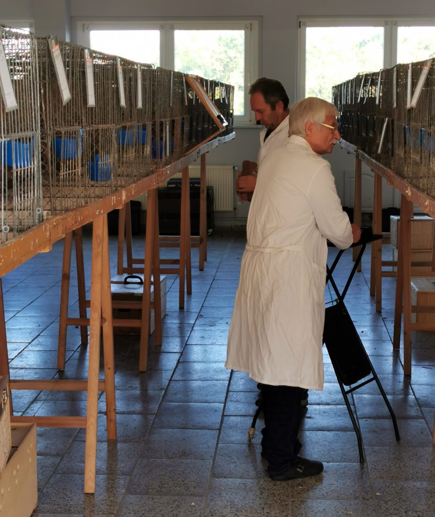 Unser Ehrenmitglied und Sonderrichter Klaus Ohlendorf bei der offenen Bewertung der weißen Täubinen und schwarzen Täuber.