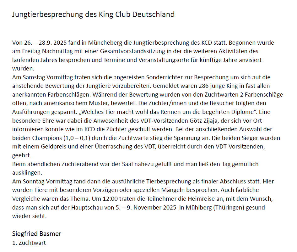 Bericht von einem Außenstehendem Besucher (Nichtmitglied im KCD) zur Jungtierbesprechung in Müncheberg